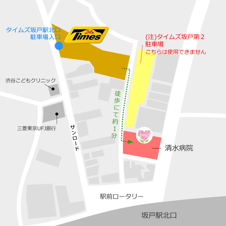 病院前に10台分の駐車場がありますが、台数が限られているため、大変ご迷惑をおかけしております。 サンロード沿いのタイムズ24(タイムズ24 坂戸北口駐車場)はサービス券をお渡しできますので、こちらもご利用ください。 診察時間帯のご面会やマザークラス出席の方は、できるだけこちらをご利用くださいますよう、お願いいたします。 TIMES24が満車の場合はお電話いたければ、ご案内いたします。